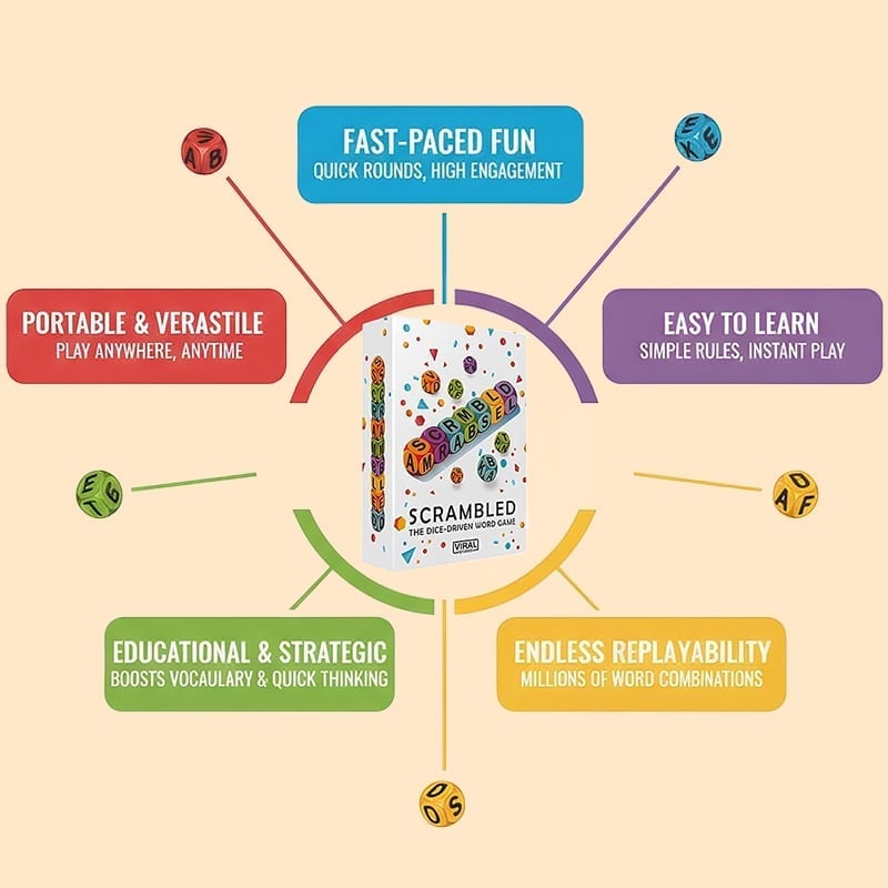 Engineered for fast-paced, strategic, and thrilling gameplay, this all-in-one word dice game delivers endless vocabulary fun for all ages, from solo brain training to chaotic party competitions.
