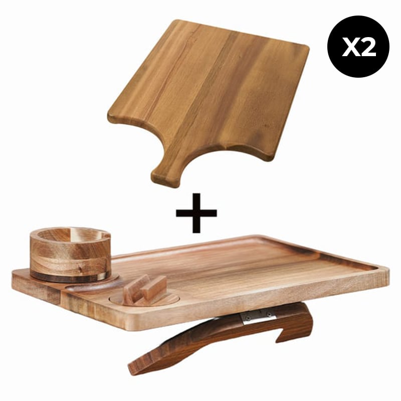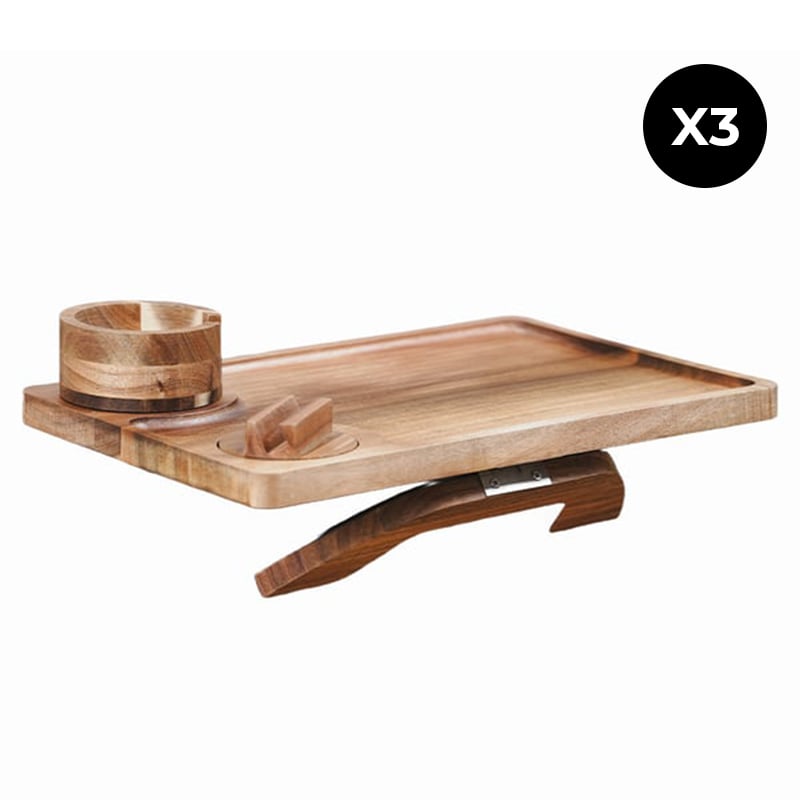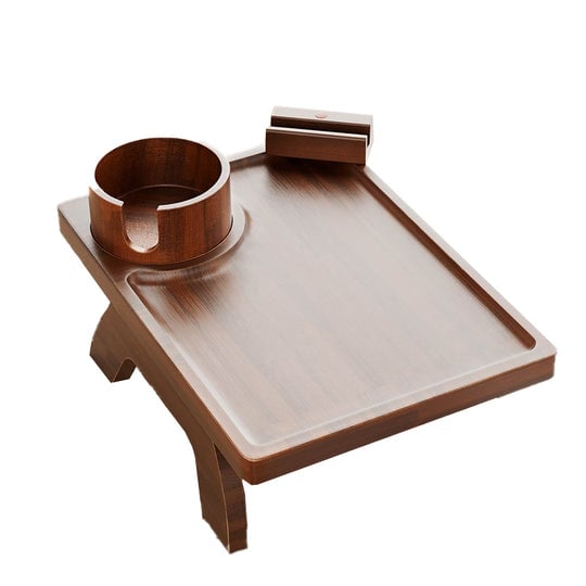[Multifunctional] - The 4-in-1 couch arm table includes a 360° rotatable phone holder, cup holder, and detachable charcuterie board. The phone holder adjusts to any angle, and the cup holder fits mugs or glasses. The charcuterie board is ideal for bread, cheese, and cooked food, and can be used on the table or separately. Food can be placed directly on the board.